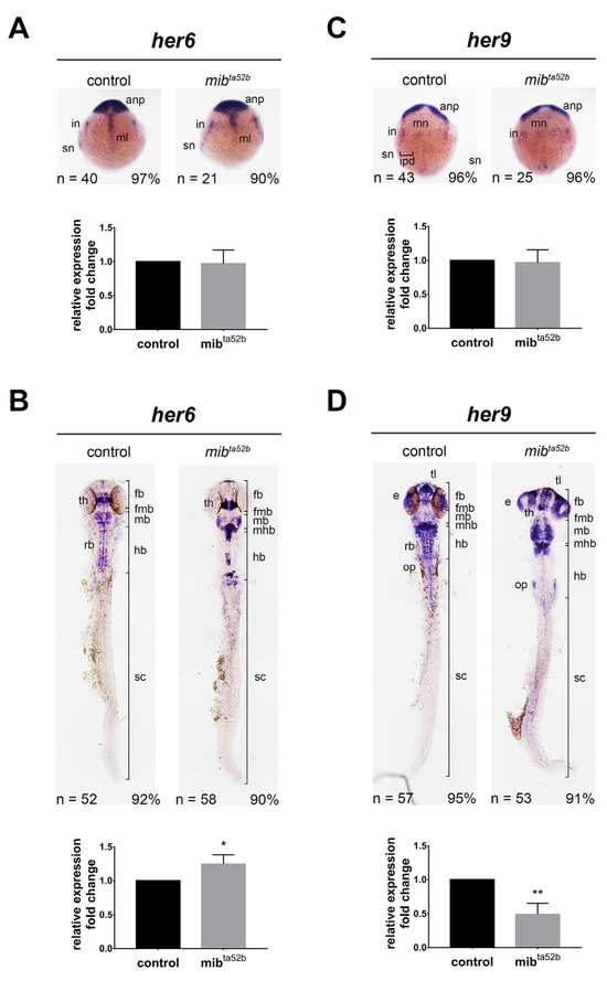 The embryos analyzed were generated by in-crossing mib1 ta52 b heterozygous parents, and her mRNA expression was assessed through in situ hybridization and reverse transcriptase quantitative PCR (RT-qPCR). The genotypes of these embryos were further confirmed using single embryo genotyping after in situ hybridization. To investigate the effect of mib1 ta52 b mutation on her expression in the developing nervous system, we focused on two developmental stages: the bud stage and 24 h post-fertilization (hpf), marking the stages of neurulation and the initiation and maturation of neurogenesis.