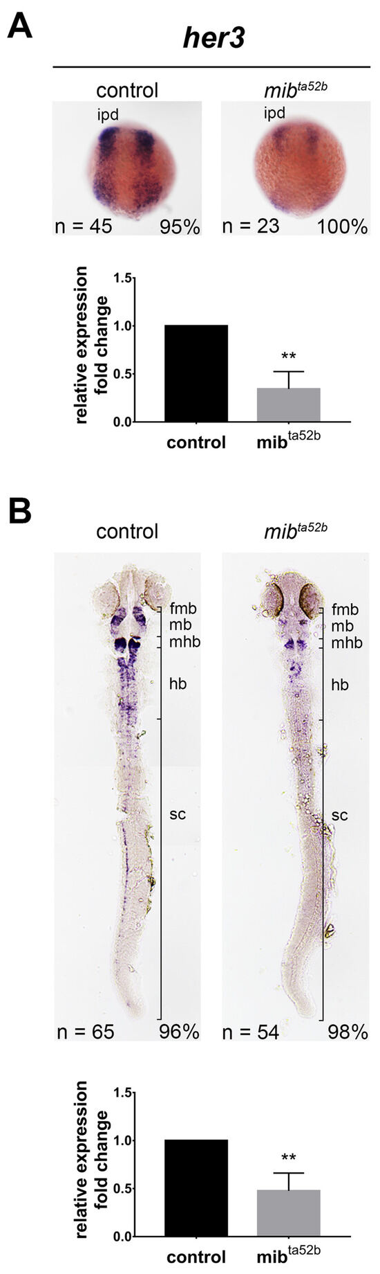 Expression of her3 in wild-type and mib1 ta52 b mutant zebrafish embryos. In situ hybridization demonstrates the expression of her3 in wild-type siblings (left panels) and mib1 ta52 b mutant embryos (right panels) at the bud stage (A) and 24 h post-fertilization (hpf) (B). Images depict dorsal views with anterior to the top. fmb, fore-midbrain boundary; hb, hindbrain; ipd, inter-proneuronal domain; mb, midbrain; mhb, mid-hindbrain boundary; scn, spinal cord neurons. The expression levels of her3 were validated using quantitative real-time polymerase chain reaction (qRT-PCR), displayed at the bottom panels. Quantitative data are presented as mean ± standard error of mean (SEM). Statistical analysis was performed by Student’s t-test. All reactions were performed in triplicate for each sample. **, p < 0.01.