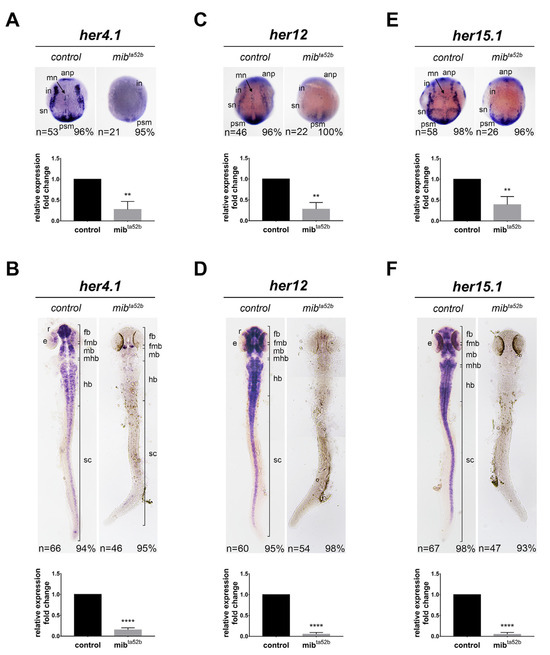 Comparison of her4.1, her12, and her15.1 expression in wild-type and mib1 ta52 b mutant embryos. The expression of her4.1 (A,B), her12 (C,D), and her15.1 (E,F) was detected in wild-type sibling embryos (left panels) and mib1 ta52 b homozygous mutant zebrafish embryos (right panels) at the bud stage (A,C,E) and 24 hpf (B,D,F) using in situ hybridization. Dorsal views with anterior toward the top. Key anatomical features include the anp, anterior neural plate; e, eye; fb, forebrain; fmb, fore-midbrain boundary; hb, hindbrain; in, interneurons; mn, motor neurons; psm, presomitic mesoderm; r, retina; sn, sensory neurons; sc, spinal cord. The expression levels were further validated using quantitative real-time polymerase chain reaction (qRT-PCR). Quantitative data are presented as mean ± standard error of mean (SEM); statistical analysis was performed by Student’s t-test. All reactions were performed in triplicate for each sample. **, p < 0.01, ****, p < 0.0001.