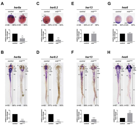 Comparison of her8 a, her8.2, her13, and hes6 mRNA expression in wild-type and mib1 ta52 b mutant embryos by in situ hybridization. The expression of her8 a (A,B), her8.2 (C,D), her13 (E,F), and hes6 (G,H) were detected in wild-type siblings (left panels) and mib1 ta52 b homozygous mutant embryos (right panels) at the bud stage (A,C,E,G) and 24 hpf (B,D,F,H). Dorsal views with anterior toward the top. ad, anterior diencephalon; fb, forebrain; hb, hindbrain; in, interneurons; mb, midbrain; mhb, mid-hindbrain boundary; mn, motor neurons; psm, presomitic mesoderm, r, retina; rb, rhombomeres; rob, rhombomere boundaries, tc, telencephalon; sn, sensory neurons; sc, spinal cord. The expression levels were validated using quantitative real-time polymerase chain reaction (qRT-PCR). Quantitative data are presented as mean ± standard error of mean (SEM). Statistical analysis was performed by Student’s t-test. All reactions were performed in triplicate for each sample. **, p < 0.01; ***, p < 0.001; ****, p < 0.0001.
