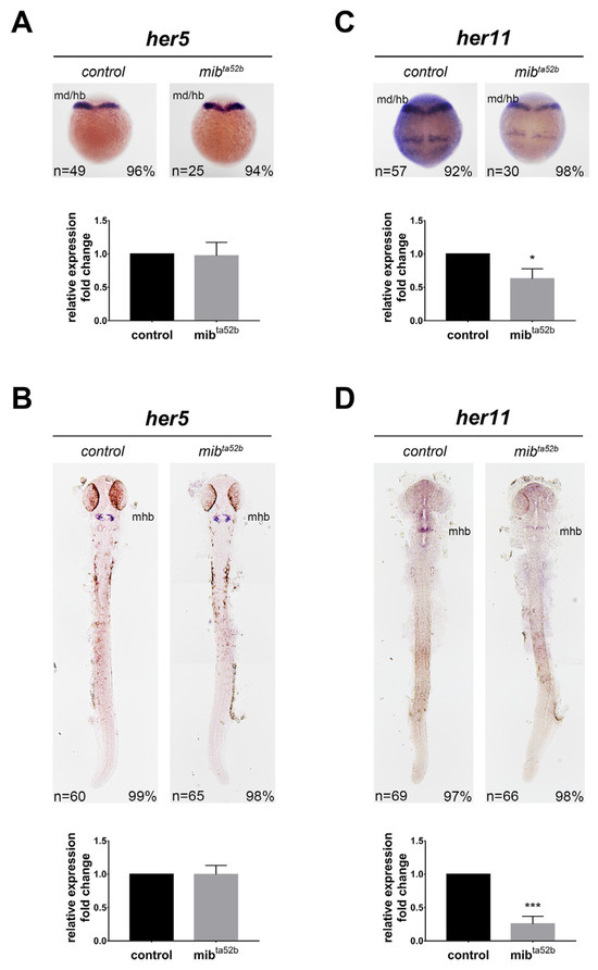 her11 is expressed in the presomitic mesoderm and regulates somitogenesis clock [39]. In the developing nervous system, her11 expression was very similar to her5 expression, as they were both expressed in the mid-hindbrain at the bud stage and in the mid-hindbrain boundary at 24 hpf. Notably, there was no significant difference in the expression of her5 between the wild-type and mib1 ta52 b homozygous mutants; however, the expression of her11 was reduced in mib1 ta52 b homozygous mutants (Figure 5). These data suggest that although the expression of her5 and her11 is co-localized and regulates the formation of the mid-hindbrain boundary, they respond to Notch signaling in different manners.