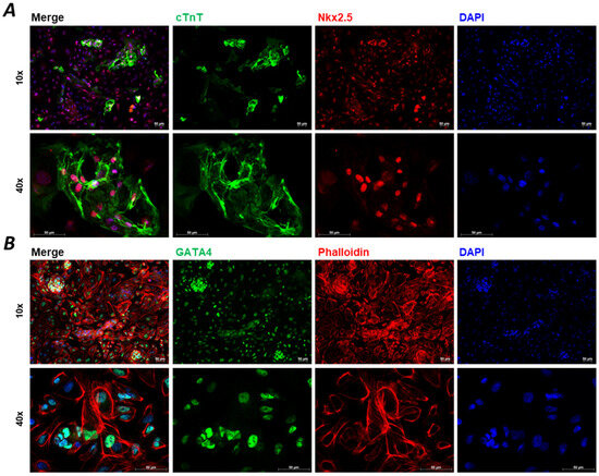 Immunocytochemistry staining of D15 2D hiPSC-CMs. Immunocytochemistry images of specific biomarkers for hiPSC-CM characterisation at Day 15 (D15). Cardiac troponin T (cTnT) is the most generally used marker for CMs, which shows apparent striations ((A), green) in the case of the development of CM sarcomere structures. Other biomarkers, such as mesodermal marker homeobox protein Nkx2.5 ((A), red), transcription factor GATA4 ((B), green), and phalloidin ((B), red) are shown, while 4′,6-diamidino-2-phenylindole (DAPI) shows nuclear staining ((A,B), blue). Images were taken on hiPSC-CMs generated by BioTalentum Ltd., at 10× and 40× magnification; scale bar, 50 μm.