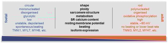 On the other hand, those hiPSC-CMs that are used for in vitro drug testing and heart-on-a-chip (HOC) platforms in healthy conditions and disease modelling lack a pivotal element: the maturation of the cells. Using existing protocols, hiPSC-CMs are developmentally immature, with foetal-like CM properties, such as glycolytic metabolism, circular cellular shape, lack of sarcomere alignment, and expression of foetal genes in their sarcomere components (e.g., TNNI1 rather than TNNI3). On the other hand, mature CMs express a different set of maturation markers (e.g., MYH7, TNNI3, connexin-43, and TTNN2B), while characterised by a distinct morphology, including hypertrophic, rod-shaped cellular body, higher myofibril density and alignment, and polyploidy (Figure 3). There are also characteristic differences in their electrophysiology; during maturation, the unstable membrane potential—constant diastolic depolarisation leading to spontaneous activity—changes to a stable resting membrane potential at around −80–90 mV.