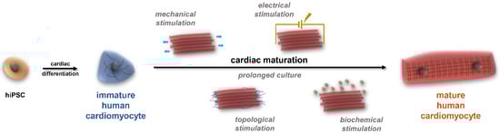 The multifactorial process of cardiac maturation. HiPSCs can differentiate into virtually all cell types. To produce beating muscle cells during cardiac differentiation, small molecules are applied; however, these cells usually do not reach the desired maturity status. To achieve maturation, several approaches are available—besides the time factor—in biomaterial sciences, including various stimuli (mechanical, electrical, topological, and biochemical stimulation, detailed in the text).