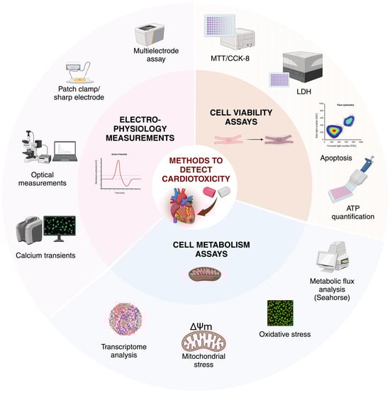 The main cardiotoxic effects include drug-induced arrhythmias or changes in cell metabolism or viability, which can lead to heart failure. There are many physiological processes that can be monitored for detecting cardiotoxicity in CMs, including electrophysiological assays, cell metabolism, viability, or oxidative stress (Figure 5). Drug-induced arrhythmias can be caused by many broadly used medications. One of the most serious conditions is QT interval prolongation, leading to torsade de pointes type ventricular tachyarrhythmias, although bradyarrhythmia, AF, tachycardia, or Brugada syndrome can also be caused [83]. It is known that blocking the potassium HERG channel leads to drug-induced prolongation of QT interval and is associated with sudden cardiac death [84].
