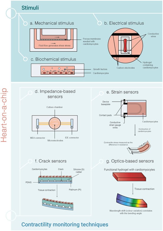Current strategies of heart-on-a-chip (HOC) systems using hiPSC-CMs. The microfluidic HOC systems serve as controlled environments to mimic as much as possible the physiological conditions that can be found in the human native heart. The most important stimuli methods (a–c) and contractility monitoring techniques are shown (d–g). Mechanical stimulation (a) provides mechanical cues to the cells, which may be shear stress (by exposing the cells to fluid flow) and/or stretch forces. Biochemical stimulation (b) consists of applying growth factors to the cells and electrical stimulation (c) can be achieved by applying small electrical pulses to the CMs. Impedance-based sensors (d) measure cardiac contraction by reading the impedance changes upon contraction of the CMs. Strain sensors (e) rely on the contraction of CMs to change the curvature of the device baseplate and measure the difference in resistance, which is then converted by a mathematical formula to the stress generated by the tissue. In crack sensors (f), the cracks in the sensor open as the tissue contracts, increasing the resistance. The contraction of the CMs causes the deformation of the hydrogel substrate leading to a wavelength shift (colour variation), which can be measured with optical sensors (g). MEA—multielectrode array; IDE—interdigitated electrodes.