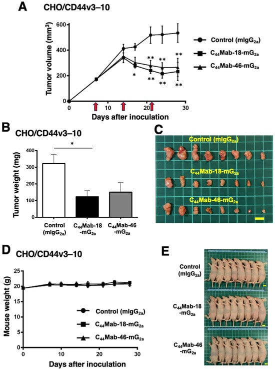 2.3. Antitumor Effects of C44Mab-18-mG2a and C44Mab-46-mG2a in the Mouse Xenografts of CHO/CD44v3–10
