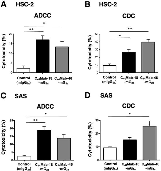 2.4. Induction of ADCC and CDC by C44Mab-18-mG2a and C44Mab-46-mG2a against HSC-2 and SAS Cells