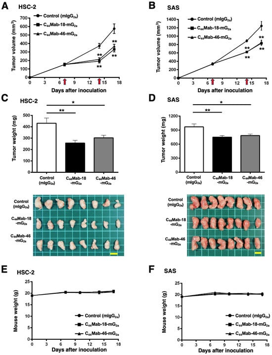 2.5. Antitumor Effects of C44Mab-18-mG2a and C44Mab-46-mG2a in the Mouse Xenografts of HSC-2 and SAS