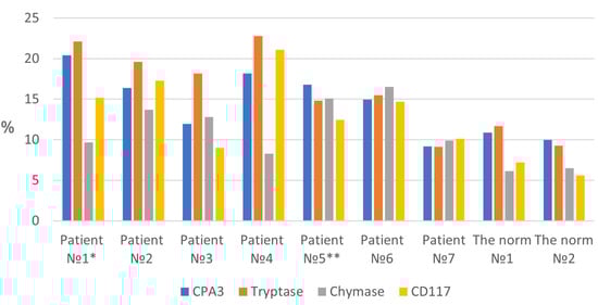 Mast cell content in the skin of patients with Marfan syndrome (in %, relative content to other cells in the dermis). Notes: *—mother of patient No. 2; **—mother of patients No. 6 and No. 7; CPA3—Carboxypeptidase A3.