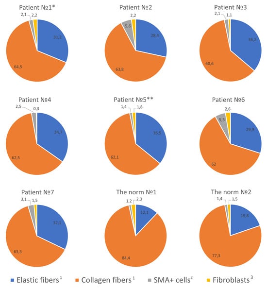 Histotopography of tryptase-positive mast cells in the skin dermis of patients with Marfan syndrome. Frequency of colocalization of MCs (%) with a fibrous component, αSMA-positive cells, and fibroblast. Staining technique: 1 multiplex detection of tryptase, elastic, and collagen fibers; 2 multiplex immunohistochemical detection of tryptase and α-SMA; 3 Giemsa staining. α-SMA: alpha-smooth muscle actin. Notes: *—mother of patient No. 2; **—mother of patients No. 6 and No. 7.
