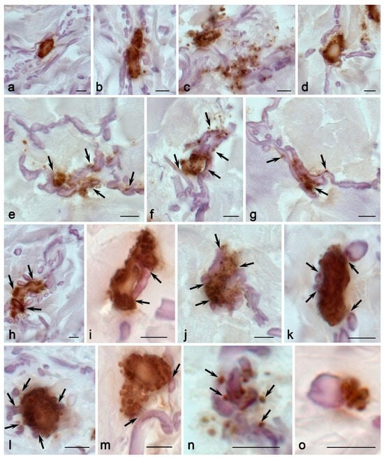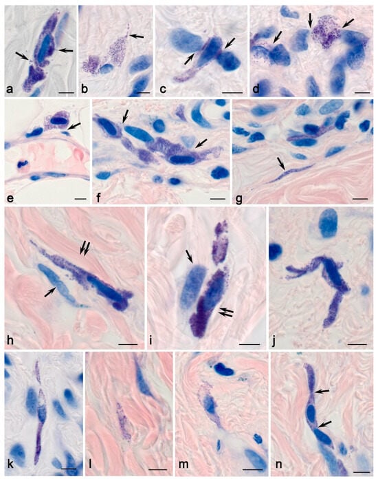 MCs had variability with respect to the cytoplasm’s shape. Elongated MCs with processes spreading over considerable distances (up to 10–30 µm only in the field of view) and more rounded MCs with well-defined granules were both detected (Figure 3a,b). With metachromatic staining, the granules appeared very small, sometimes resembling dust-like stippling (Figure 3h,i). MCs with well-differentiated and filled granules in the cytoplasm were quite rare. The most common arrangement of granules in the cytoplasm was loose, with a prevalent accumulation in the near-membrane area (Figure 3c,k,m).