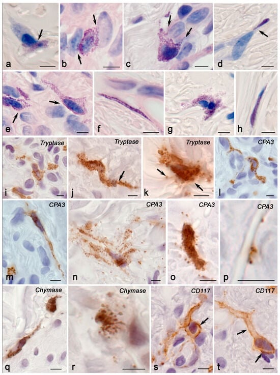 Mast cells in the skin dermis in Marfan syndrome. Technique: (a–h) staining with Giemsa solution, (i–t) immunohistochemical staining for tryptase (i–l), carboxypeptidase A3 (m–p), chymase (q,r), and CD117 (s,t). Notes: (a–e) options for various MC colocalizations with fibroblasts (arrowed). (f) A nuclear-free area in the cytoplasm of an elongated MC. (g,h) Secretion of heparin-containing granules onto elastic fibers. (i) A group of MCs closely localized to fibroblasts. (j) Directed distribution of tryptase over long distances in the skin dermis (arrowed). (k) Active tryptase secretion onto the elastic fiber (arrowed). (l) Group of interacting CPA3+ MCs. (m) An elongated MC with a predominantly peripheral localization of CPA3 in the cytoplasm. (n–p) Active targeted secretion of CPA3 onto elastic fibers. MC granules adjacent to elastic fibers. (q,r) Active chymase degranulation onto fibers and cells of the skin dermis. (s,t) Predominantly peripheral localization of CD117 in the MC cytoplasm (arrowed). Scale: 5 µm. CPA3—Carboxypeptidase A3.