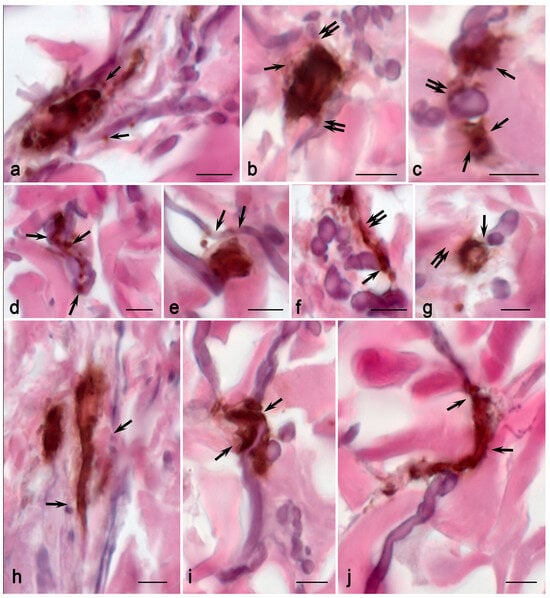 Mast cell mapping in the fibrous landscape of the skin dermis in MFS. Technique: Combined Weigert–Van Gieson staining with immunohistochemical tryptase detection. Notes: (a) Simultaneous tryptase secretion onto the collagen and elastic fibers in the skin dermis (arrowed). (b) Formation of a pericellular zone of extracellular matrix remodeling (arrowed) and its impact on elastic fibers (double arrowed). (c) Active effect of tryptase on the collagen ECM (double arrowed) and extensive areas on the surface of elastic fibers (arrowed). (d) Selective localization of autonomous secretory MC granules in the elastic fiber area in the skin dermis (arrowed). (e) Selective tryptase secretion onto elastic fibers with a difference in their histochemical properties (arrowed). (f,g) Active entry of tryptase into areas of contact with collagen (arrowed) and elastic fibers (double arrowed). (h) Evident remodeling of the skin dermis by mast cells, with visible signs of elastic fiber destruction (indicated by an arrow). (i,j) Variants in MC localization in the tensometric areas of the elastic network of the skin dermis (arrowed), with intense tryptase secretion on the surface of the fibers. Scale: 5 µm.