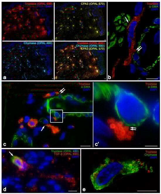 Secretory profile of skin MCs in Marfan syndrome. Technique: Multiplex immunohistochemistry with simultaneous detection of tryptase, chymase, and CPA3 (a) and tryptase with αSMA (b,c) and TGFβ (d). Notes: (a) MCs in the skin dermis with a predominant Tryptase+Chymase+CPA3+ profile. (b,c) Colocalization of MCs with smooth myocytes in the microvasculature (double arrowed) and α-SMA-positive cells (arrowed), with active tryptase secretion. (d,e) High level of TGF-β expression in MCs in the skin dermis (arrowed). Scale: (c’) 2 µm; (e) 5 µm; the rest—10 µm. CPA3: carboxypeptidase A3. TGF-β: transforming growth factor beta.