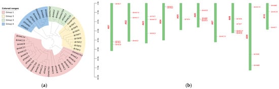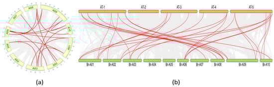 Gene colinearity is an indicator of gene duplication events []. A total of 17 pairs of colinear BrHAT genes were identified (Figure 3a). The covariance of BrHAT genes was observed on all chromosomes, with the exception of chromosome A04. Tandemly duplicated genes accounted for 72.4% of gene families, suggesting that gene-associated duplication is a possible origin for some BrHATs and an important mechanism for gene family expansion. To further explore the replication events of BrHATs, genomic covariance between B. rapa L. and A. thaliana (Figure 3b) was analyzed. The gray bands connect all genes with covariance in B. rapa L., and the red lines link HAT genes exhibiting covariance, indicating that highly homologous replicative relationships were likely generated by the same gene duplication event. genes lacking covariance are presumed to have mutated. Intraspecific covariance analysis revealed tandem duplications on neighboring proximal and distal chromosomes. A comparison with the A. thaliana genome revealed 29 covariance relationships between BrHAT genes and AtHATs genes, indicating that the number of BrHATs was increased in B. rapa L.