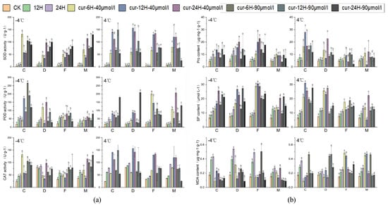 Under low-temperature conditions, plants regulate the content of soluble substances and the concentration of MDA through the activation of a series of molecular mechanisms related to cold resistance, thereby regulating cellular osmotic pressure, reducing the degree of membrane lipid peroxidation, and improving their low-temperature tolerance []. Under −4 °C treatment, the MDA content of each variety was lower after curcumin treatment compared with the CK (Figure 9b). The reduction in the MDA content was more pronounced in the 90 μM curcumin treatment than in the 40 μM curcumin treatment following −4 °C treatment. Similarly, the content of proline and soluble protein markedly increased following curcumin treatment. After exposure to −4 °C, CT-2360, which is weakly cold-resistant, had higher levels of proline and soluble protein after 12 h of treatment. The content of proline peaked at 24 h in weakly cold-resistant varieties, and the soluble protein content varied substantially after curcumin treatment. Patterns of variation in the TSA treatment were similar to patterns of variation in the curcumin treatment, suggesting that both TSA and curcumin treatments can reduce low-temperature stress-induced cell damage by decreasing membrane lipid peroxidation, regulating osmotic pressure in the plant cytoplasm, and modulating the cellular redox potential. Furthermore, the results of the TSA treatment were comparable to those of the curcumin treatment, indicating that both treatments can effectively decrease cell damage caused by low-temperature stress by reducing the oxidation of membrane lipids, regulating the osmotic pressure within the plant cytoplasm, and adjusting the cellular redox potential (Figure S3). The results indicated that the extent of the reduction depends on the cold tolerance of the treated materials and the concentration of the inhibitor.