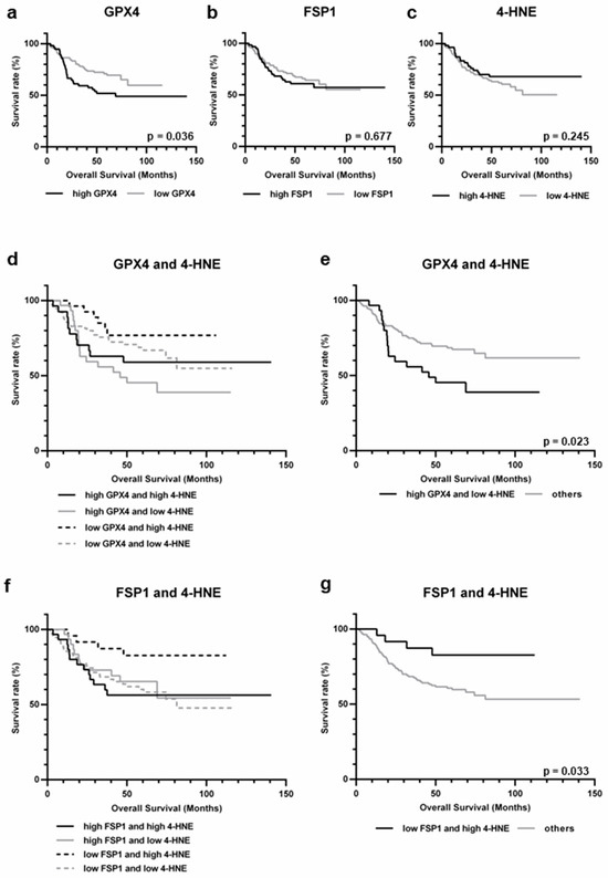 Kaplan–Meier analysis of gastric cancer, stratified by result of immunohistochemistry. (a) High expression of GPX4 correlated with poor prognosis (p = 0.036). (b) No significant difference was observed between FSP1 high and low groups (p = 0.677). (c) No significant difference was observed between 4-HNE high and low groups (p = 0.245). (d) Stratification based on GPX4 and 4-HNE. (e) The prognosis of high GPX4 expression and low 4-HNE accumulation was worse than that of the others (p = 0.023). (f) Stratification based on FSP1 and 4-HNE. (g) The prognosis of low FSP1 expression and high 4-HNE accumulation was better than that of the others (p = 0.033).