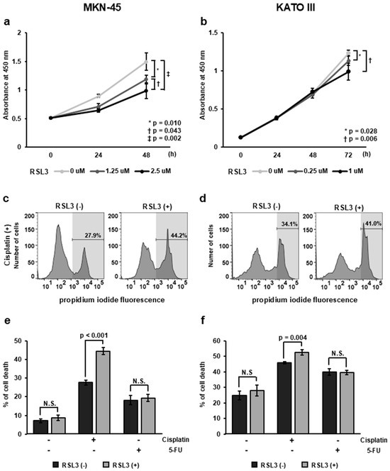 To determine how GPX4 contributes to the survival of GC cells, we examined whether RSL3 treatment altered the apoptosis-inducing cell death rate caused by cisplatin or 5-FU. RSL3 significantly enhanced cisplatin-induced cell death in both MKN-45 (Figure 3e) and KATOIII cells (Figure 3f) (MKN-45, p = 0.006; KATO III, p = 0.043). Cell death induced by 5-FU was not enhanced by RSL3.