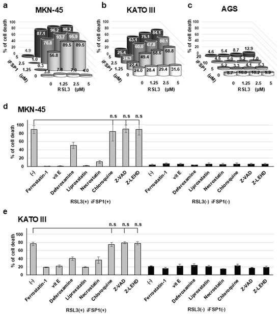 Synergistic effects of GPX4 and FSP1 inhibition on cell death induction. (a–c) Cell death rates with administration of RSL3, an inhibitor of GPX4, and iFSP1, an inhibitor of FSP1. In MKN-45 (a) and KATO III (b) cells, the synergistic effects on cell death induction were observed; in AGS (c) cells, combined treatment did not dramatically increase the cell death rate. (d,e) Investigation of type of cell death by cell death inhibitors. Cell death was fully inhibited by ferrostatin-1, vitamin E (vit E), liproxstatin, ferroptosis inhibitors, and necrostatin, necroptosis inhibitor. Cell death was partially inhibited by deferoxamine, an iron chelator.