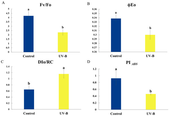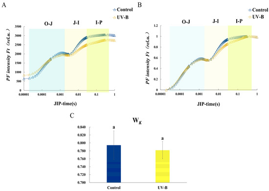The O and P phases’ variations in OJIP transient curves are depicted in Figure 1A. The findings demonstrated that the amplitude of the I, P, and I–P phases was dramatically decreased by UV-B stress.