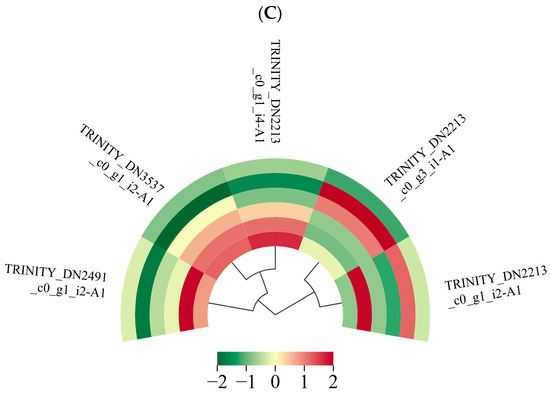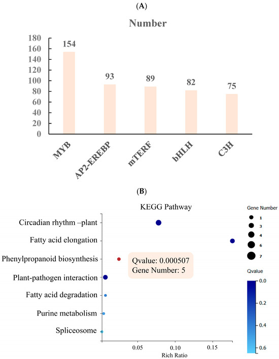 The R. chrysanthum was found to have 28 classes of transcription factors responsive to UV-B stress based on transcriptomic assays. The five classes of transcription factors with the greatest number of transcription factors responsive to UV-B stress are depicted in Figure 3A, while the remaining classes are shown in the Supplementary file (Figure S1). The study found that MYB transcription factors were the most enriched, with 154 transcription factors undergoing enrichment analysis. The outcomes demonstrated that the primary impact on phenylpropane production was caused by MYB transcription factors (Figure 3B). Two genes had upregulated and three downregulated expression, according to an expression study of five important genes enriched to the phenylpropane biosynthesis pathway (Figure 3C).