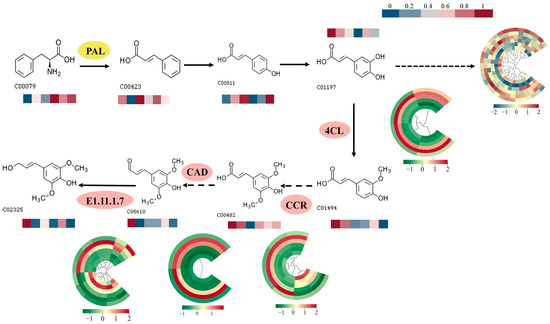 MYB transcription factors control the biosynthesis of lignin in R. chrysanthum under UV-B stress. PAL: phenylalanine ammonia-lyase; 4CL: 4-coumarate:CoA ligase; CCR: cinnamoyl-CoA reductase; CAD: cinnamyl alcohol dehydrogenase; E1.11.1.7: peroxidase. Data on metabolite content and gene expression were plotted on a heat map after being normalized using the formula (Xi − min(x))/(max(x) − min(x)). A bar heat map is used to show changes in metabolite content, with bluer colors denoting lower levels and redder colors representing higher levels. Changes in gene expression are represented by a circular heat map, in which the three biological replicates of the control and the three biological replicates of the UV-B stress treatment are indicated sequentially from the inner to the outer layers, with redder colors indicating higher expression and greener colors indicating lower expression.
