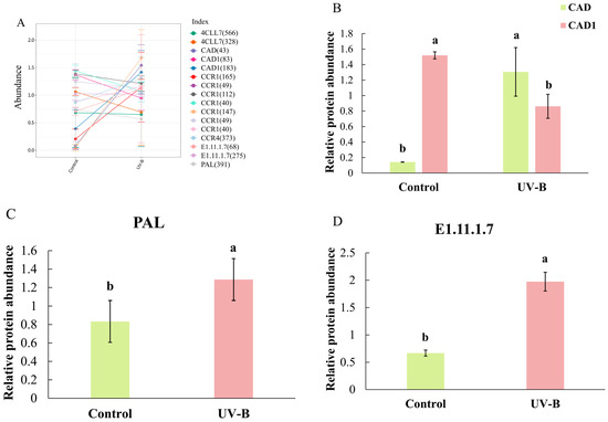 The acetylation proteomics of R. chrysanthum identified 9371 acetylation sites on 3754 proteins, of which 5063 sites on 1991 proteins contained quantitative information. We then conducted a systematic bioinformatics analysis of proteins with quantitatively informative sites. The five important enzymes shown in Figure 4’s lignin biosynthesis pathway had their acetylation modifications analyzed. The majority of the important enzymes in the lignin biosynthesis pathway, such as CAD1 (183), E1.11.1.7 (68), CCR1 (165), CAD (43), CCR1 (147), 4CLL7 (566), E1.11.1.7 (275), 4CLL7 (328), CCR1 (40), and PAL (391), were shown to have acetylation upregulation, according to the data (Figure 5A). Among them, there was a considerable upregulation of PAL (391), CAD (43), and E1.11.1.7 (68) (Figure 5B–D).