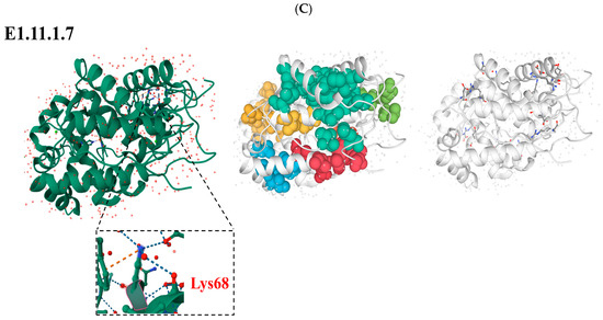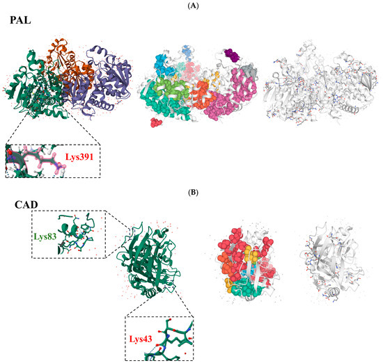 Our three-dimensional structures of PAL, CAD, and E1.11.1.7 were built using the three enzymes that were screened above and showed notable alterations in acetylation modifications. We also labeled the acetylation site (Figure 6). We examined the three enzymes’ salt-bridge structures and water-transport clusters in order to gain a molecular understanding of the characterization and function of the proteins. According to the findings, PAL has 13 hydrophobic clusters, and the areas of these clusters range from 76.0 to 5638.7 Å (Figure 6A). There were two to forty residues and two to one hundred and eighty-eight interactions among the residues. Based on calculations, 74 salt bridges with a K (kappa value) of 0.14 and an FCR (fraction of charged residues) of 0.29 were found in PAL. The hydrophobic cluster areas of the eight hydrophobic clusters in CAD range from 79.6 to 2887.0 Å (Figure 6A). There were two to twenty-one residues and two to sixty-two interactions among the residues. Based on calculations, it was found that CAD had 12 salt bridges with a K (kappa value) of 0.16 and an FCR (fraction of charged residues) of 0.22. Eight hydrophobic clusters with hydrophobic cluster sizes ranging from 58.3 to 2944.1 Å are seen in E1.11.1.7 (Figure 6C). There were between two and twenty residues total, and there were between two and sixty-four interactions among the residues. Nine salt bridges with a K (kappa value) of 0.18 and an FCR (fraction of charged residues) of 0.12 can be found in E1.11.1.7, according to calculations.