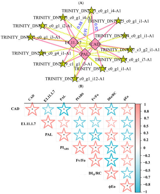Based on the findings of the correlation between physiological parameters and the acetylation modifications of key lignin synthesis enzymes, CAD and PAL were found to be positively correlated with Fv/Fo and DIo/RC, respectively. This suggests that the acetylation modifications of these two enzymes are connected to the possible activity of PSII (Figure 7B).