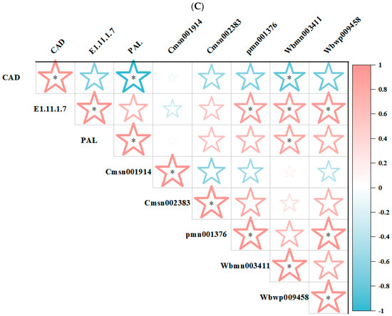 The expression of the enzyme genes, particularly those corresponding to RcTRP5, exhibited a significant negative correlation with the acetylation modification of the key enzyme for lignin synthesis (Figure 7A). These correlations were 0.91, 0.92, and 0.88 with PAL, CAD, and E1.11.1.7, respectively, indicating that the RcTRP5 transcription factors modulate the acetylation modification of the enzyme and thereby affect lignin biosynthesis.