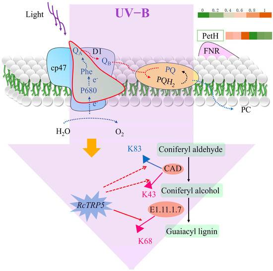 The response of R. chrysanthum to UV-B stress in an illustration. The red solid line in PSII indicates impaired light and performance after UV-B radiation, the red dashed line in the pathway indicates indirect upregulation, the red solid line indicates direct upregulation, the pink arrowheads indicate upregulation of the acetylation site, and the blue arrowheads indicate downregulation of the acetylation site.