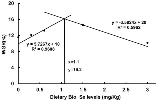 Relationship between weight gain rate (WGR) and dietary Bio−Se levels based on a broken-line regression analysis.
