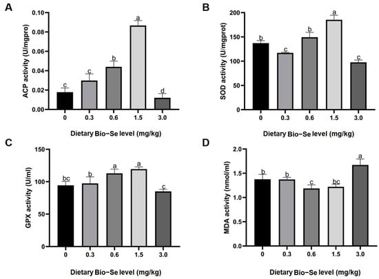 Effects of different levels of dietary Bio−Se on activities of (A) acid phosphatase (ACP), (B) superoxide dismutase (SOD), (C) glutathione peroxidase (GPX), and (D) maleic dialdehyde (MDA) in hepatopancreas. The data are shown as mean ± standard deviation (n = 3). Different letters indicate significant differences at p < 0.05 and no significant differences with the same letters (p > 0.05).