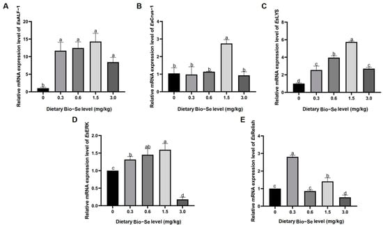 Similarly, the transcripts of EsERK showed a significant (p < 0.05) up-regulation following the increasing Bio−Se concentration (0.3 mg/kg, 0.6 mg/kg, and 1.5 mg/kg), with the highest level in the 1.5 mg/kg Bio−Se group. Meanwhile, 3.0 mg/kg of Bio−Se significantly (p < 0.05) inhibited the expression level of EsERK (Figure 3D). For the expression pattern of EsRelish, it was found that the expression was increased in the 0.3 mg/kg and 1.5 mg/kg Bio−Se group and decreased in the 3.0 mg/kg Bio−Se group compared to that in the 0 mg/kg group (Figure 3E).
