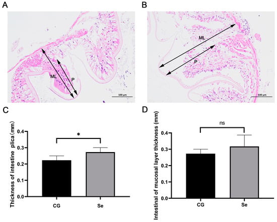 The intestinal morphology of E. sinensis in the control group and Bio−Se group. The intestinal morphology determined by HE staining in control group (A) and Bio−Se group (B). The statistical analysis of the thickness of intestine (C) and thickness of intestine mucosal layer (D). P, the thickness of intestinal plica; ML, the thickness of intestinal mucosal layer; CG, control group (0 mg/kg of Bio−Se); Bio−Se, Bio−Se group (1.5 mg/kg of Bio−Se); data are shown as mean ± standard deviation (n = 3); * p < 0.05; ns, no significant difference.