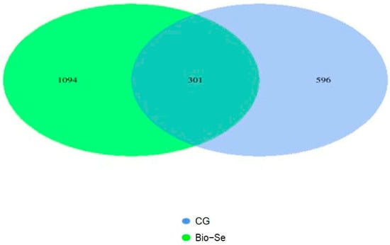 A total of 481,957 clean reads were obtained from the sequencing of 6 intestinal microbial samples, with an average of 80,326 reads per individual sample. The sequence lengths ranged from 423 to 427 base pairs. A Venn diagram analysis revealed that 301 operational taxonomic units (OTUs) were shared by the control and Bio−Se groups (Figure 4). Notably, an average of 1094 OTUs and 596 OTUs were unique in the Bio−Se group and control group, respectively (Figure 5).