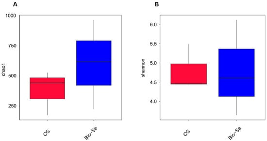 Alpha diversity analysis of the intestinal microbial communities of E. sinensis in the control group (CG) and Bio−Se group (Bio−Se) according to the (A) Chao-1 and (B) Shannon indexes. Chao-1 and Shannon show the total number of species and classifications in the community sample, respectively. CG, control group (0 mg/kg of Bio−Se); Bio−Se, Bio−Se group (1.5 mg/kg of Bio−Se).