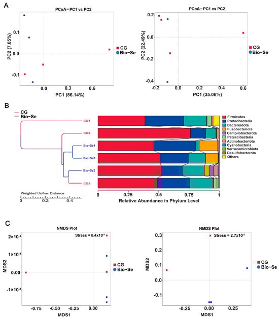 The Chao 1 index indicated that the Bio−Se group had a greater richness in intestinal microbial communities compared to the control group (Figure 6A). The Shannon Index was utilized to assess the species diversity of the intestinal microbiota; the results showed that intestinal microbial diversity was higher in the Bio−Se group (Figure 6B). The principal coordinate analysis (PCoA) of microbial communities revealed the separation between the control group and the Bio−Se group (Figure 7A). Meanwhile, two different separate classifications of bacterial communities were also observed between the control group and the Bio−Se group (Figure 7B). The non-metric multidimensional scaling (NMDS) analysis further confirmed the difference in microbial community structure between the two groups (Figure 7C).