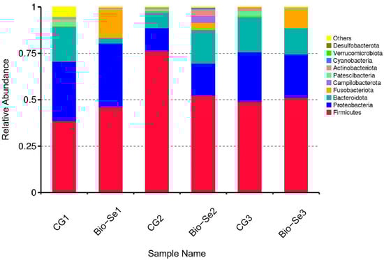 The intestine microbial population composition at the phylum level is shown in Figure 7. The dominant intestine bacterial species were Firmicutes (54.62%), Proteobacteria (23.66%), and Bacteroidetes (15.47%), accounting for 93.75% of the total phylotypes (Figure 8, Table 3). Similarly, Firmicutes (49.81%), Proteobacteria (25.02%), and Bacteroidota (11.77%) were also the top three phyla in the Bio−Se group, accounting for 86.60% of all phylotypes (Figure 8, Table 3). Moreover, the Fusobacteriota abundance was increased, and in the Bio−Se group, the relative abundance of Fusobacteriota was about 24.5-fold that in the control group (Figure 8, Table 3).