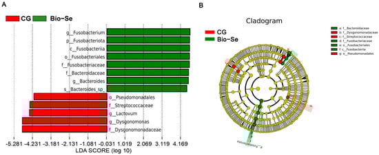 Furthermore, the LEfSe analysis was applied to identify the variation of intestinal microbes after Bio−Se feeding (Figure 9). There were seven bacterial taxa, including Bacteroides, Bacteroidaceae, Fusobacteriaceae, Fusobacteriales, Fusobacteriia, Fusobacteriota, and Fusobacterium, that were enriched in the Bio−Se group. Meanwhile, Dysgonomonadaceae, Dysgonomonas, Lactovum, Streotooccaceae, and Pseudomonadale were enriched in the control (CG) group.