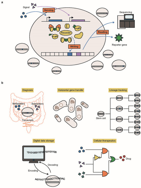 While several approaches such as temporal RNA-seq [4,5,6] and biosensors [7,8,9] have been devised to address these challenges in biological measurement, they are still constrained by their temporal resolution and the number of channels available for data acquisition. Utilizing DNA as a data storage medium provides high-capacity storage, high density, and long-term stability to encode various types of data [10,11]. Advanced next-generation sequencing (NGS) technologies have facilitated convenient, cost-effective, and high-throughput decoding of information stored in DNA [12]. Furthermore, the inherent compatibility between DNA data storage and living systems has spurred the development of various DNA-based cellular recording techniques, which have the potential to acquire multiple and temporal biological information without disrupting cells (Figure 1a) [3]. Many different applications of DNA-based cellular recording have been demonstrated, such as diagnosing disease biomarkers [13,14], capturing horizontal gene transfer (HGT) events [15,16], tracking cellular lineages throughout embryonic development [17,18], storing digital data [19,20], and constructing genetic circuits for therapeutic applications [21] (Figure 1b).