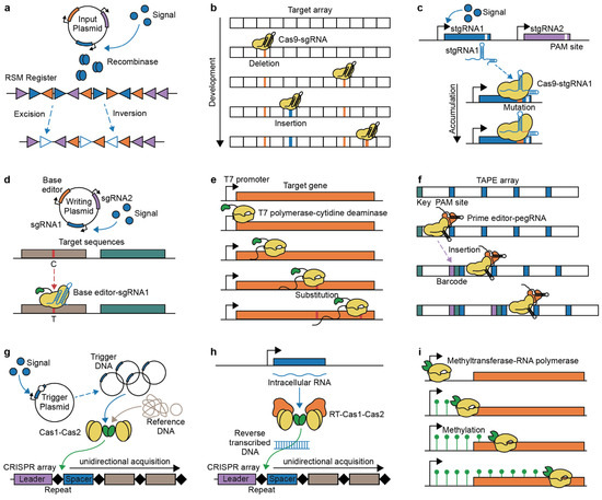 - Shipman, S.L.; Nivala, J.; Macklis, J.D.; Church, G.M. Molecular recordings by directed CRISPR spacer acquisition. Science 2016, 353, aaf1175. [Google Scholar] [CrossRef]