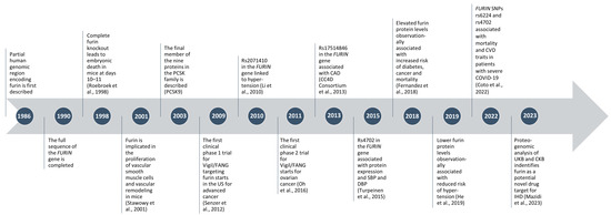Figure 1. Key milestones since the discovery of furin including notable findings from epidemiological and genetic studies [4,11,14,19,20,21,22,23,24,25,26]. Abbreviations: PCSK = proprotein convertase subtilisin/kexin; Vigil/FANG = an immunotherapy designed to target furin expression; CAD = coronary artery disease; SBP = systolic blood pressure; DBP = diastolic blood pressure; CVD = cardiovascular diseases; UKB = UK BioBank; CKB = China Kadoorie BioBank; IHD = ischaemic heart disease.