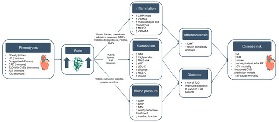 Here, we undertake a critical assessment of observational and genetic population studies of furin in relation to CVD and present our findings in a narrative review. Our search used the PubMed (https://pubmed.ncbi.nlm.nih.gov/ accessed on 15 January 2024) and GWAS Catalog (https://www.ebi.ac.uk/gwas/ accessed on 15 January 2024) online databases to identify studies which associated furin with CVD risk factors and outcomes, and also identified clinical studies of treatments targeting furin (https://clinicaltrials.gov accessed on 15 January 2024). Human studies using cross-sectional, interventional, case-control, or prospective designs are included, and several in vitro, in vivo, and animal studies are described. Studies looking at SARS-CoV-2 infection and comorbidities were largely excluded, as this was not a focus for the current review. Our main objectives were (1) to evaluate the available evidence linking furin with CVD risk factors and outcomes in population studies; (2) to identify clinical studies of drug treatments targeting furin; and (3) to discuss research approaches to further understand the relevance of furin for the treatment and prevention of CVD.
