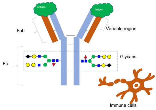 12]. For instance, the glycans attached to the Fc region of mAbs regulate interactions with Fc receptors and complement proteins, affecting effector functions such as antibody-dependent cellular cytotoxicity (ADCC) and complement-dependent cytotoxicity [
