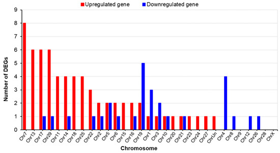 The DEGs exhibited high prevalences on chromosomes 7, 13, 17, and 29 for the upregulated genes and on chromosomes 19, 4, 1, 3, and 5 for the downregulated genes. Single upregulated genes were identified on chromosomes 7, 13, 11, 18, and 25, and chromosomes 4, 8, 12, and 26 exclusively harbored downregulated genes, as shown in Figure 5.