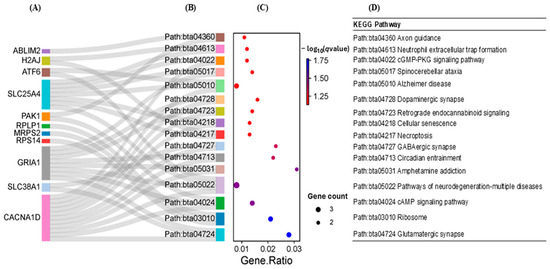Figure 6 presents the top 16 significant terms (q < 0.10) derived from the KEGG pathway analysis. This list includes glutamatergic synapse, cAMP signaling, GABAergic synapse, the cGMP-PKG signaling pathway, and neutrophil extracellular trap formation. Within these pathways, a total of 11 genes were identified, notably including CACNA1D, GRIA1, and SLC25A4, which were upregulated and linked to multiple pathway terms. In addition, the downregulated genes, such as ATF6, PAK1, and SLC38A1, were each associated with two pathway terms.