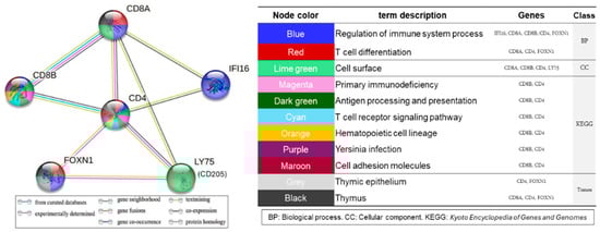 The genes IFI16, CD8a, CD8b, CD4, and FOXN1 were linked with pathway terms associated with the regulation of the immune system (Figure 7). In addition, the BP T cell differentiation term was linked to CD8a, CD4, and FOXN1. The CC category was the cell surface term, and it was associated with CD8a, CD8b, CD4, and LY75 (CD205). Notably, only CD4 and CD8b were associated with the six pathway terms in KEGG. Within the tissue development category, two pathway terms were identified: the thymic epithelium term was associated with CD4 and FOXN1, and the thymus term was associated with CD8a, CD4, and FOXN1. Moreover, CD4 and CD8 were associated with the primary immunodeficiency pathway in KEGG, which implies a potential link between MNR and defective immunity in the Wagyu fetal thymus (Figure S2).