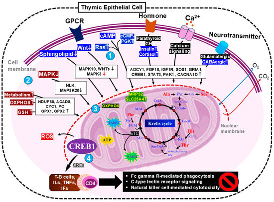 Theoretical framework comprising the pathways associated with the DMGs and DEGs associated with molecular function networks and metabolism in the thymuses of LN fetuses. (1) cAMP, Ras, cGMP–PGK, insulin, cortisol, and GABAergic synapse pathways, which are associated with hypoDMG, and Wnt and sphingolipid signaling pathways, which are associated with hyperDMG. (2) Pathways associated with upregulated genes, encompassing metabolic pathways, oxidative phosphorylation (OXPHOS), glutathione (GSH) metabolism, and reactive oxygen species (ROS). (3) Reprogramming of the mitochondrial metabolism via OXPHOS may be facilitated by MRPS2 and SLC25A4, with the oxidation of amino acids (His, histidine; Ser, serine; Ala, alanine; Phe, phenylalanine; and Thr, threonine) in the Krebs cycle generating ATP to support immune regulation. (4) cAMP-response element-binding protein 1 (CREB1) regulates energy production via mitochondrial OXPHOS and cAMP-response elements (CREs), thereby promoting immune cell development and, in particular, the generation of activated CD4 cells. Prolonged CD4 expression is associated with the suppression of immune pathways, including Fc gamma R-mediated phagocytosis, C-type lectin receptor signaling, and natural killer cell-mediated cytotoxicity. Up and down arrows indicate upregulation/hypomethylation and downregulation/hypermethylation, respectively, and the red arrows represent promoter hypermethylation. Pathways with a black background did not differ between the two groups.
